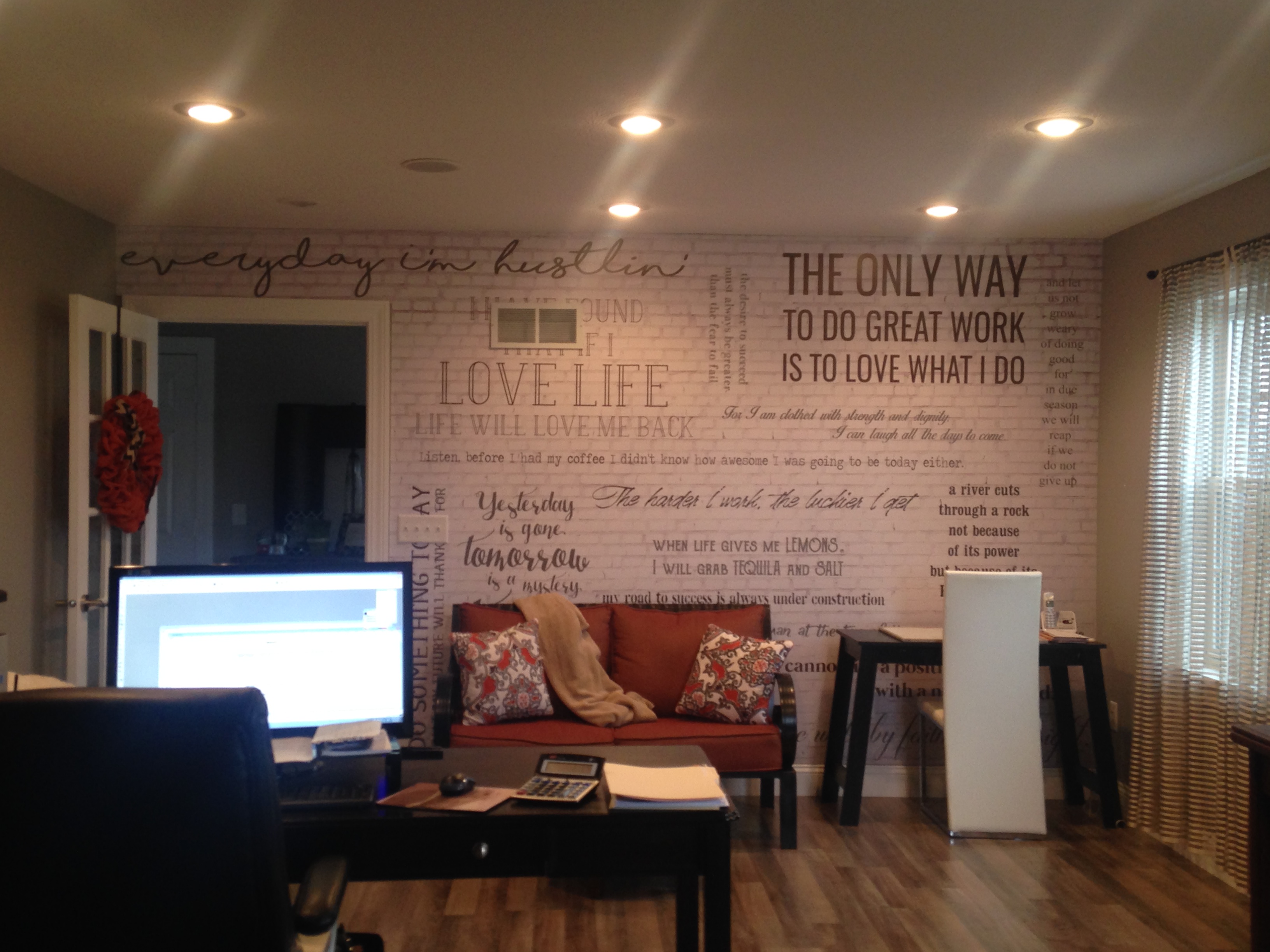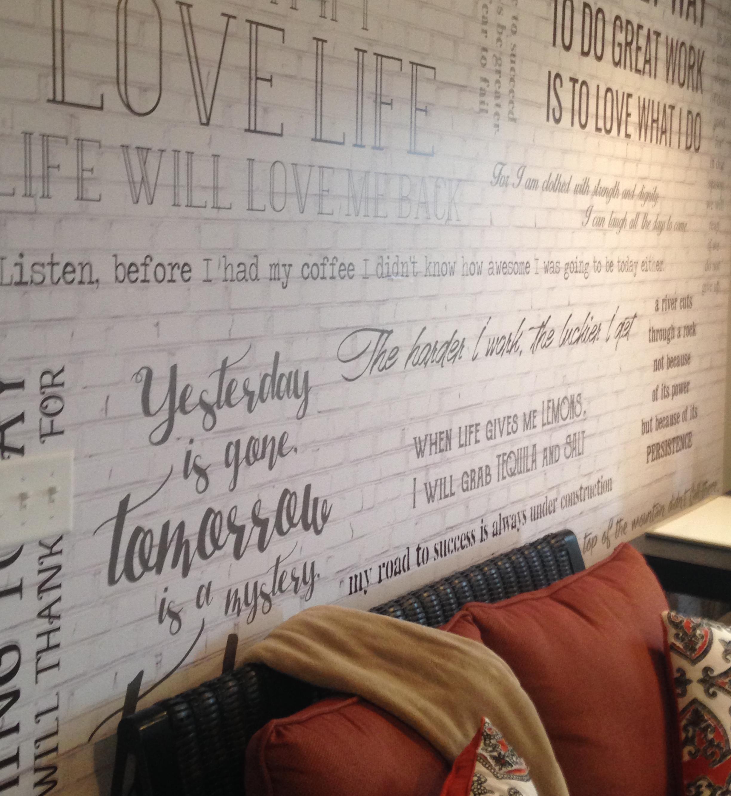 I have a work of quotes and verses saved on my desktop that I've come across over the years or even wrote myself. I use these when posting inspiring messages, or even when I need some inspiration myself. I knew I wanted a mural with my quotes, so I translated some measurements and wants and needs to my designer Ashleigh and had it on my walls within a few days. And the best part, I didn't have to fix and paint!